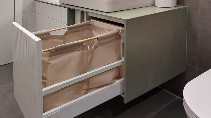 obsahuje i integrovaný textilní koš na prádlo a bezúchytkové otevírání zajišťuje čistý design a snadnou údržbu.