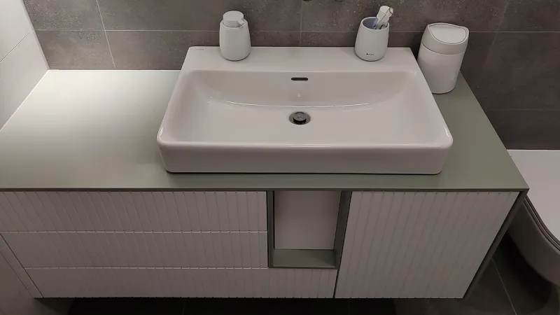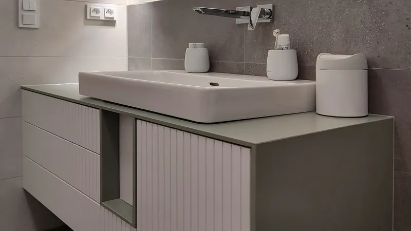 spojuje otevřenou vodoodolnou niku z technického kamene s uzavřeným úložným prostorem za lakovanými dvířky s jemným drážkováním. V otevřené nice jsou skrytá dvířka s reverzními panty pro přístup k sifonu, takže technické prvky neruší celkový vzhled.