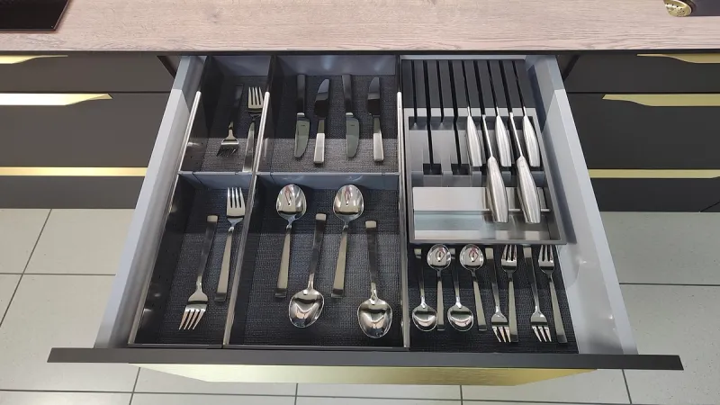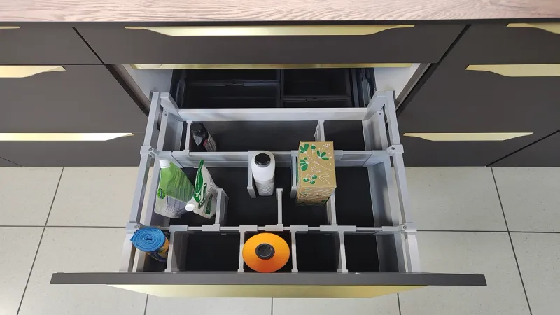 zásuvkách vytváří přehledné a logické uspořádání kuchyňských potřeb, takže každá věc má své přesné místo. Pomáhá efektivně využít celý objem zásuvky, zabraňuje chaotickému vrstvení a zrychluje každodenní práci v kuchyni.